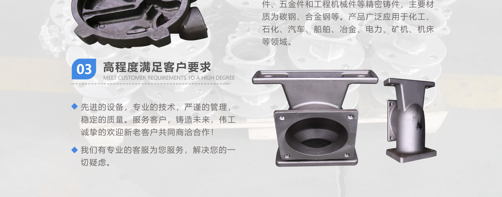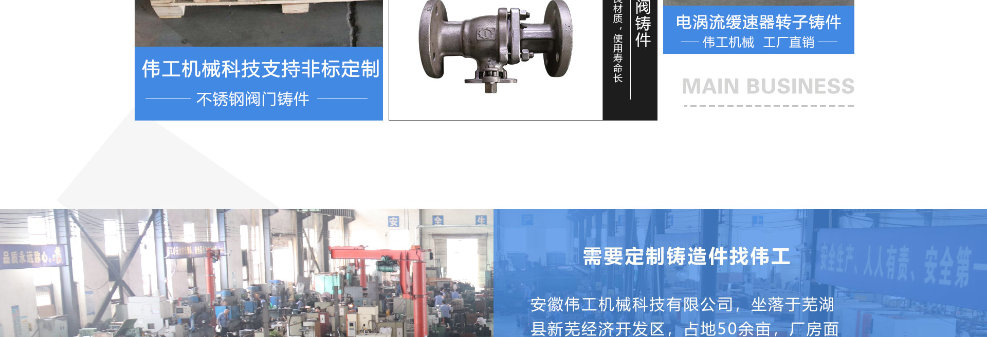 安徽偉工機(jī)械科技有限公司,坐落于安徽蕪湖新蕪經(jīng)濟(jì)開發(fā)區(qū),是一家専業(yè)從事鑄造產(chǎn)品設(shè)計(jì)、研發(fā)、生產(chǎn)、銷售于一體的企業(yè),公司為客戶的產(chǎn)品提供多樣的技術(shù)支持與設(shè)計(jì),公司主要鑄造技術(shù)有潮模砂鑄造、硅溶膠精鑄工藝。主要產(chǎn)品有:不銹鋼閥門配件、泵閥配件、汽車配件、工業(yè)管道配件、工程機(jī)械配件、汽車配件等。材質(zhì)為:低合金鋼、304、316、316L、鉻鉬鋼、哈氏合金、碳鋼、雙相鋼等。公司已先后通過(guò)ISO9001和TS16949等多種體系審核,以完備的管理手段和齊全的檢測(cè)設(shè)備滿足客戶需求,進(jìn)的設(shè)備,専業(yè)的技術(shù),嚴(yán)謹(jǐn)?shù)墓芾恚€(wěn)定的質(zhì)量。服務(wù)客戶,鑄造未來(lái),偉工誠(chéng)摯的歡迎新老客戶共同商洽合作